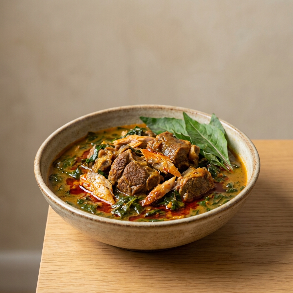 With goat meat or cowskin, smoked fish, periwinkle (on request)